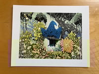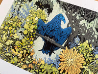 I’ve been accused of my artwork taking an autobiographical slant without me knowing it and honestly they’re probably right. Inspired by a very large raven that visits our gardens daily and some of the vegetation I enjoy seeing on my trips to Richmond. Ruin in the Stand is a large pen and ink drawing that has been digitally colored and made available as prints.